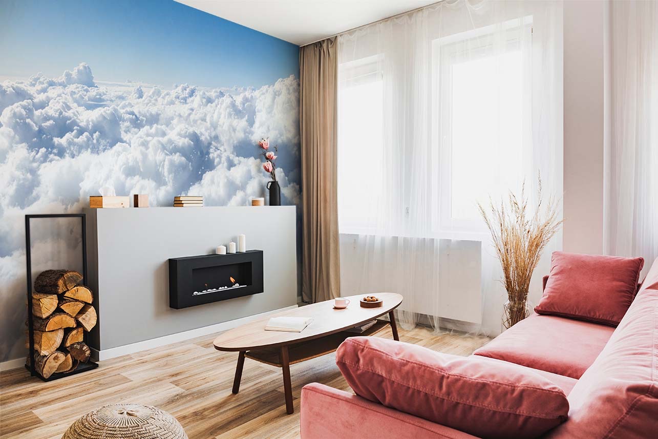 Fototapete mit Wolken im gemütlichen Wohnzimmer