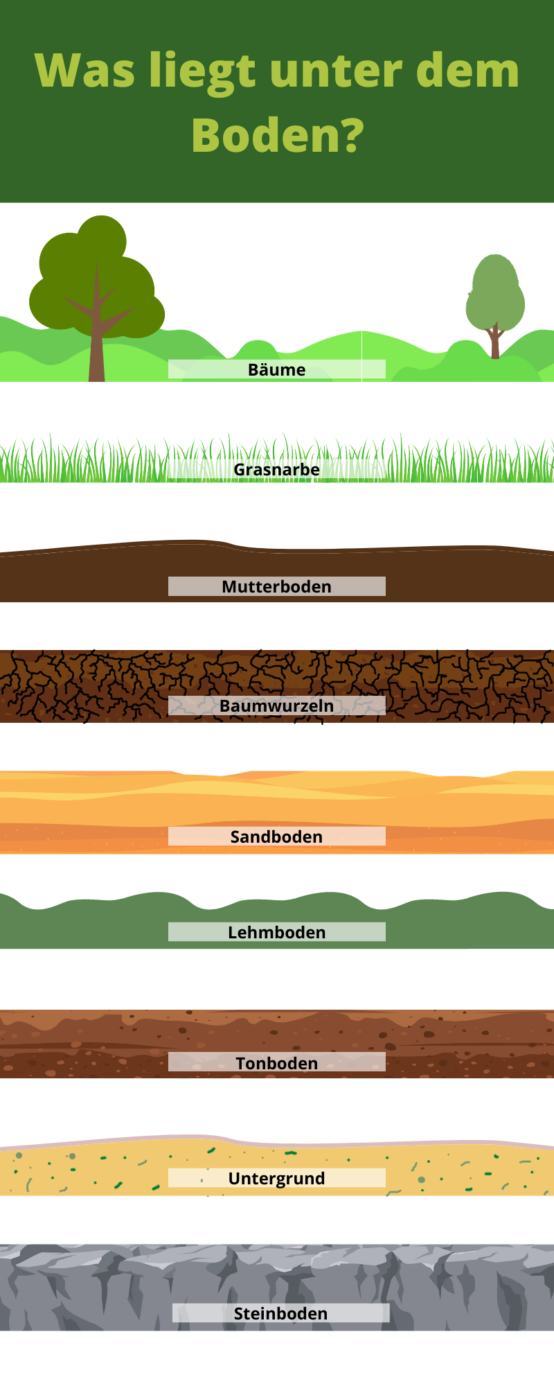 - Unterschiedlicher Untergrund: Was dann folgt, ist je nach Region unterschiedlich. Es handelt sich meist um Sand, Lehm oder Ton. Auch Steine können sich in dieser Schicht befinden.